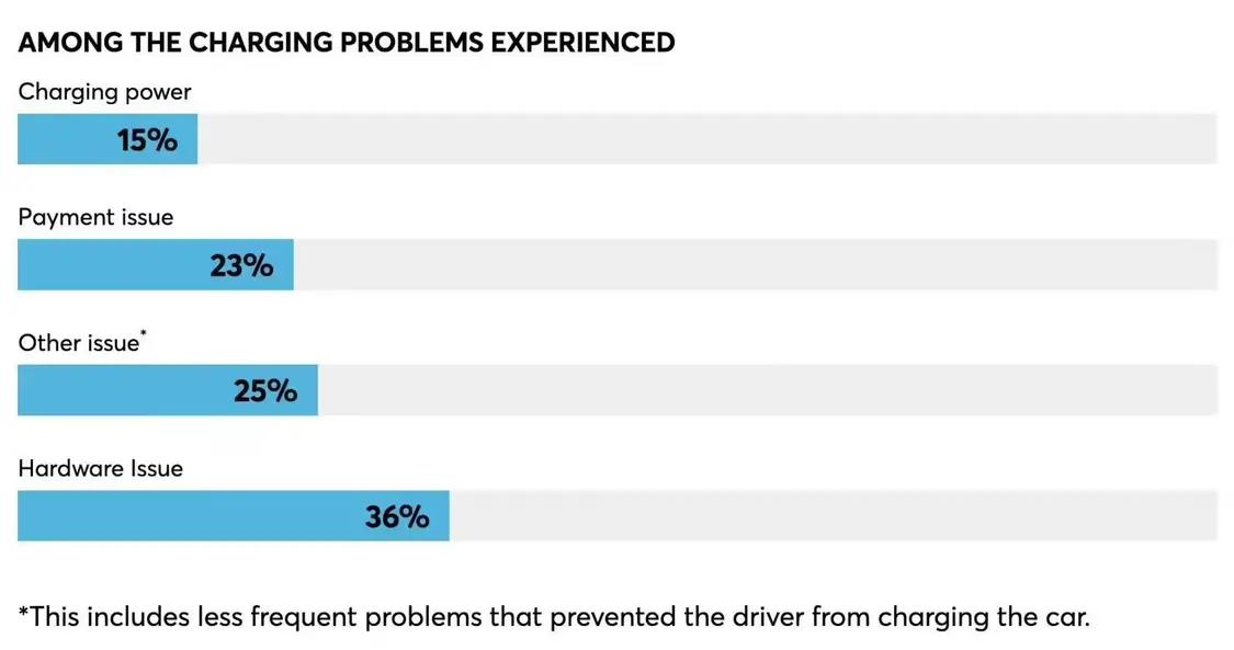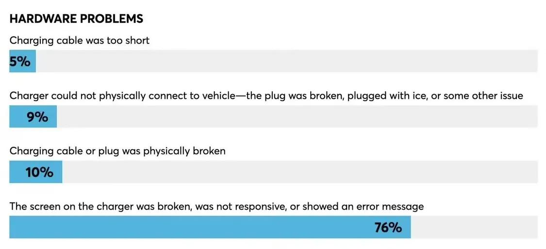 研究指出,硬件问题是充电故障的主要原因,76%的受访者表示遇到过屏幕损坏、无响应或显示错误信息的情况。此外,支付问题和充电功率不足也是常见问题。IT之家附上相关图片如下:
