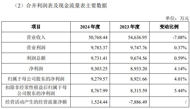 2024年,公司营收5.08亿元,同比下降7.08%;净利润为9303.25万元,同比增4.14%。