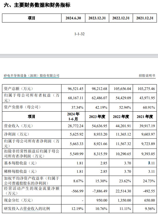 矽电股份具体提到,对三安光电、兆驰股份的重大依赖风险。2021年度至2024年上半年,公司来自于三安光电、兆驰股份的销售收入合计占比分别为25.52%、60.26%、44.22%和21.06%。2022年,公司来自于三安光电、兆驰股份的收入占比超过50%,当期经营业绩对上述客户存在一定程度的依赖。