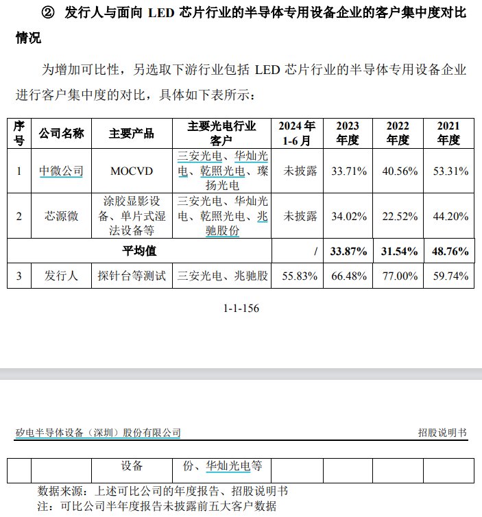 矽电股份还选取了同样面向LED芯片行业的两家可比公司:中微公司和芯源微。2021年至2023年,这两家企业的客户集中度平均值分别为48.76%、31.54%、33.87%,同样低于矽电股份。