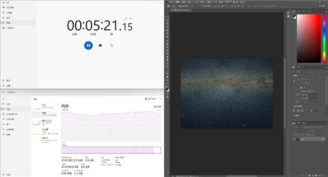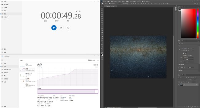 以实际测试为例,我们在相同平台上使用2条16 GB容量内存与云彣(UniWhen®)煌系列96 GB(48GB*2)套条进行对比。二者在导入24 GB大小的星空图上存在极为明显的差距,整个导入过程(直至图片可操作为止)前者需要约5分21秒,而后者仅需约49秒。足以证明虚拟内存虽然能够解决容量问题,但体验远不如升级大容量的物理内存。