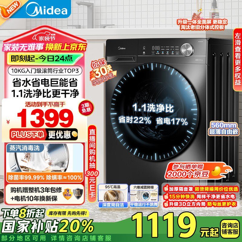 美的简尚系列MG100V36T滚筒洗衣机10kg大容量仅918元