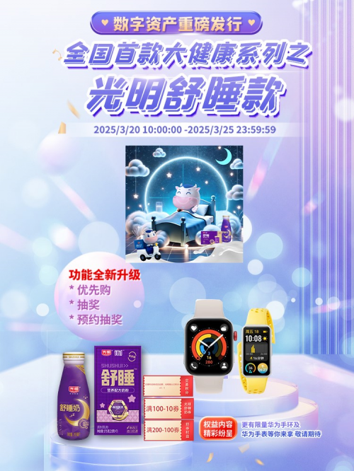 除此之外,在数字化浪潮汹涌澎湃的当下,光明乳业以行业先锋之姿,重磅推出全国首款大健康系列之光明舒睡款数字资产。光明随心订APP作为此次数字资产发行平台,全面焕新升级数字资产板块功能,为用户带来前所未有的沉浸式体验。本次数字资产权益非常丰富,包括了1元支付体验14天舒睡奶、每个季度末发放给持有用户光明舒睡奶满减券、限量HUAWEI手环以及HUAWEI手表等等,并且本次光明随心订APP数字资产板块功能全新升级,包括了发行历史项目部分用户空投、标杆项目优先购、光明随心订APP数字资产板块和官方社群抽奖优先购、预约抽签购买以及候补公售等等,各种与用户互动玩法精彩纷呈,诚意满满。这不仅是数字资产发行模式的突破,更是光明乳业引领行业创新发展的有力证明。