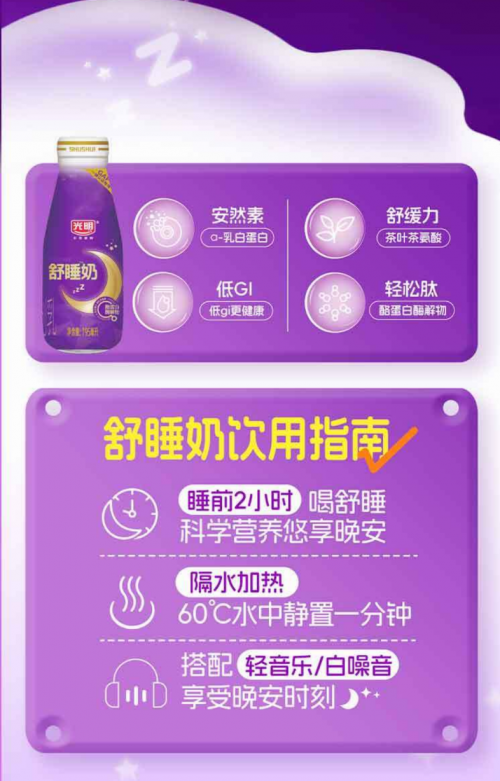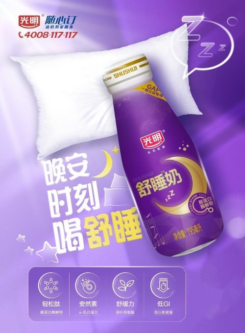 光明乳业舒睡奶系列新品瞄准“睡眠经济”。其中,光明舒睡牛奶甄选GAP一级牧场的优质奶源,采用优于欧盟标准的生牛乳作为原料,并配比多种有助于睡眠的成分;光明优加舒睡奶粉特别添加了全新光明自主知识产权专利菌株——唾液链球菌嗜热亚种BD9818,还添加了传统食材酸枣仁粉和茯苓粉,传统与现代的结合,使光明优加舒睡奶粉成就更舒适的睡眠体验。