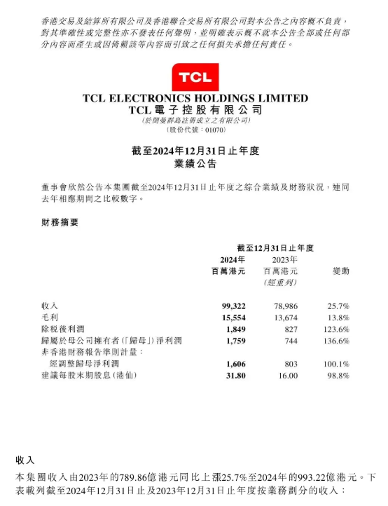 2025年3月21日,香港TCL电子控股有限公司(“TCL电子”或“公司”,01070.HK)截至2024年12月31日的年度业绩。年内,公司大尺寸业务增长远超行业,叠加创新业务规模快速扩大,公司2024年整体收入同比增长25.7%至993.2亿港元;同时,公司积极把握政策机遇,“中高端+大屏化”战略成效显著,带动2024年毛利同比增长13.8%至155.5亿港元,整体业绩实现高质量增长。