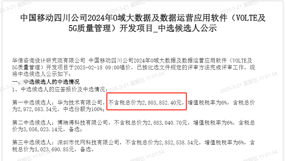 招标公告发布两周后,2月21日,项目中标候选人公示,华为成为第一中标候选人,博瑞得科技、优网科技落标。从报价来看,华为报价最低,但三家企业报价差距并不大。