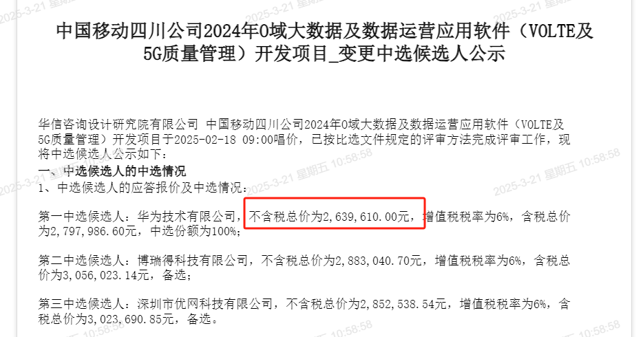 近日,四川移动2024年O域大数据及据数据运营应用软件(VOLTE及5G质量管理)开发项目进行变更中标候选人公示,但内容却不同寻常,并非变更中标人。