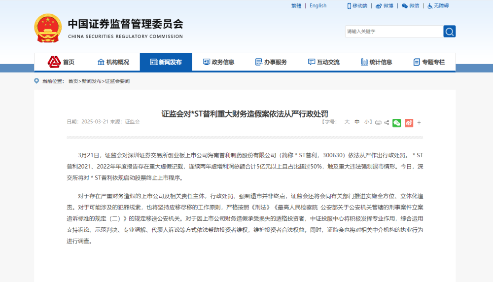 根据3月21日《证监会对*ST普利重大财务造假案依法从严行政处罚》,*ST普利2021、2022年年度报告存在重大虚假记载,连续两年虚增利润总额合计5亿元以上且占比超过50%,触及重大违法强制退市情形。同日,深交所对*ST普利依规启动股票终止上市程序。