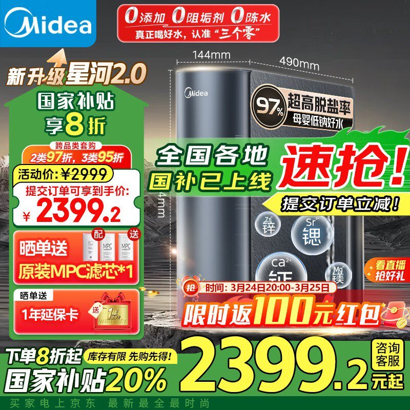 美的双子星MRC2088-1000G反渗透纯水机大通量京东特惠