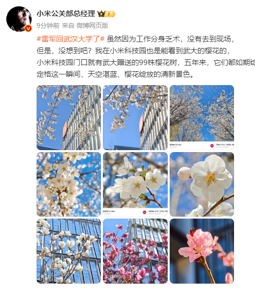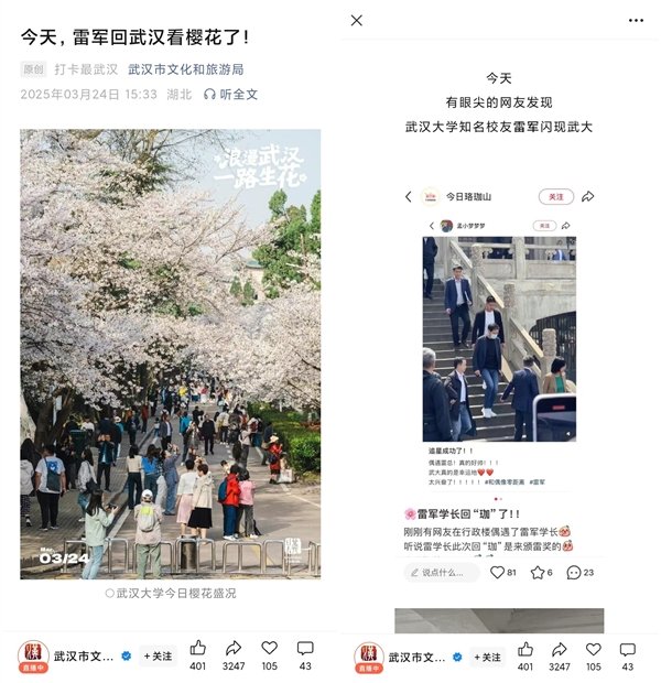 快科技3月24日消息,今日,据武汉市文化和旅游局公众号,小米科技创始人近日雷军“闪现”武汉大学看樱花。