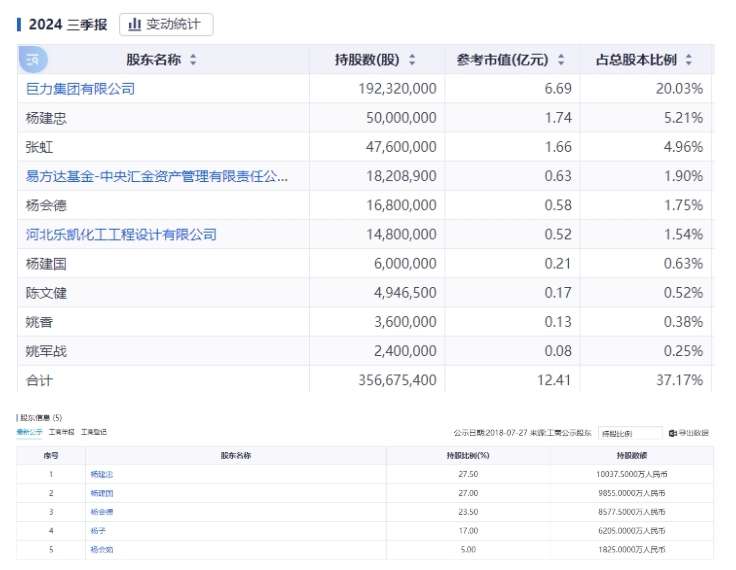 巨力索具上市之前,杨氏家族成员共同持股比例接近九成,首次公开发行后,进入前十大股东的杨氏家族成员占总股本近七成,杨子也在十大股东行列。