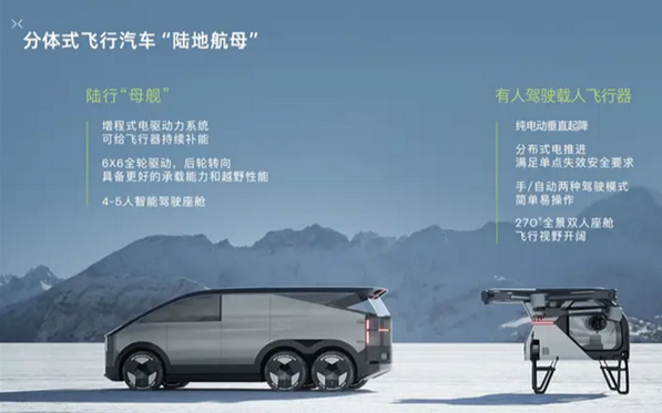 资料显示,小鹏分体式飞行汽车“陆地航母”采用3轴6轮设计,长宽高分别约为5.5米、2米、2米,搭载全域800V碳化硅高压增程平台,续航里程超1000公里,同时能在行驶和停车时为飞行器充电,支持5-6次飞行。