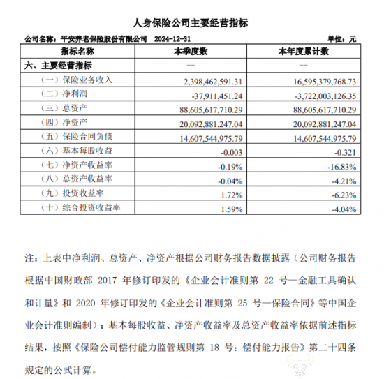 值得一提的是,平安养老在2024年再次出现了亏损。2024年该公司的保险业务收入约为165.95亿元,净亏损金额达到了37.22亿元。同时,平安养老在表中标注上述净利润的计算采用了新会计准则。