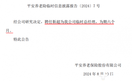 在2024年8月30日,平安养老发布公告显示,决定聘任靳超为公司的临时总经理,为期6个月。目前,靳超任此职时间显然已超过半年,还未有其转正的相关公告发布。