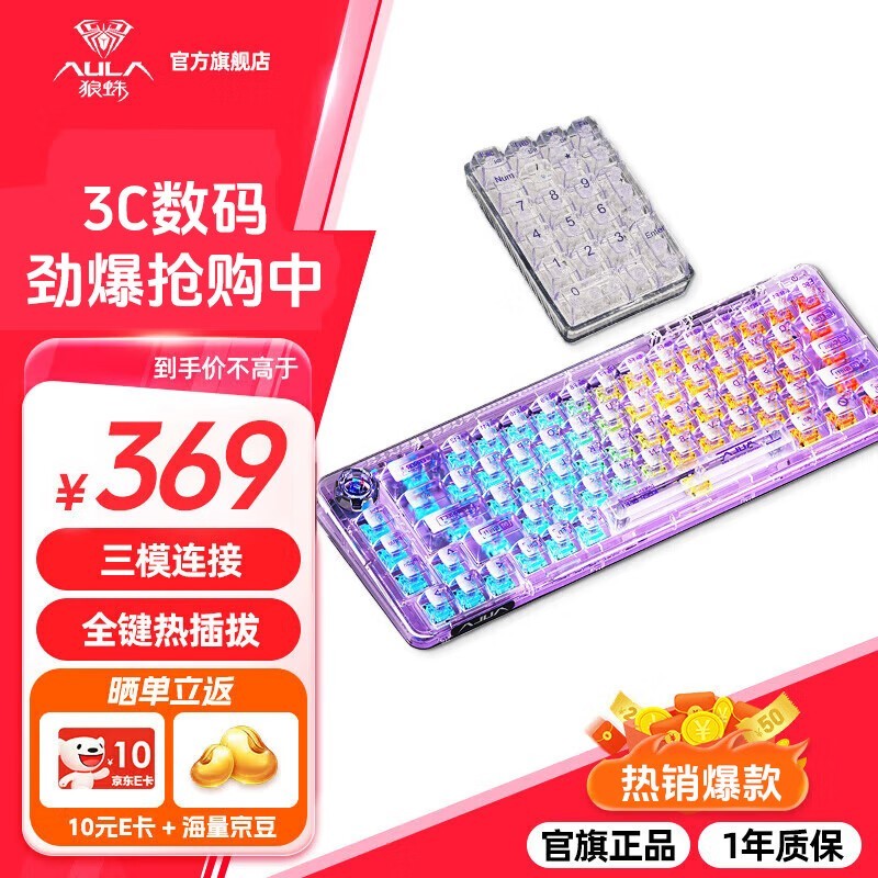 狼蛛F68透明三模机械键盘 领券289元