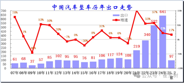 【CNMO科技消息】近日,乘联会秘书长崔东树发布了《2025年1-2月中国汽车出口市场分析》,其中指出,2025年2月中国汽车出口42万台,同比增长7%,1-2月累计出口97万台,较2024年同期增速达17%。