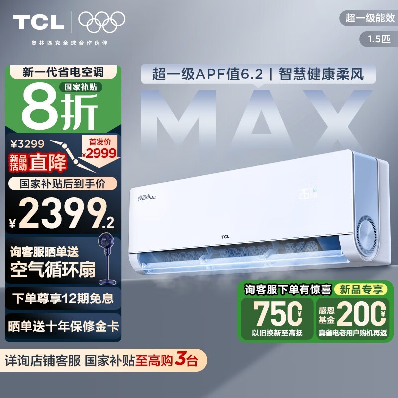 TCL小蓝翼空调1匹变频冷暖省电40%仅1739元