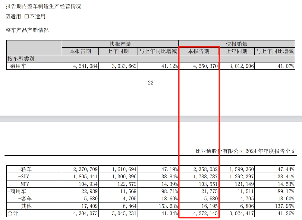 整车制造生产经营情况方面,2024年,比亚迪乘用车销量超425万辆,同比增长41.07%。