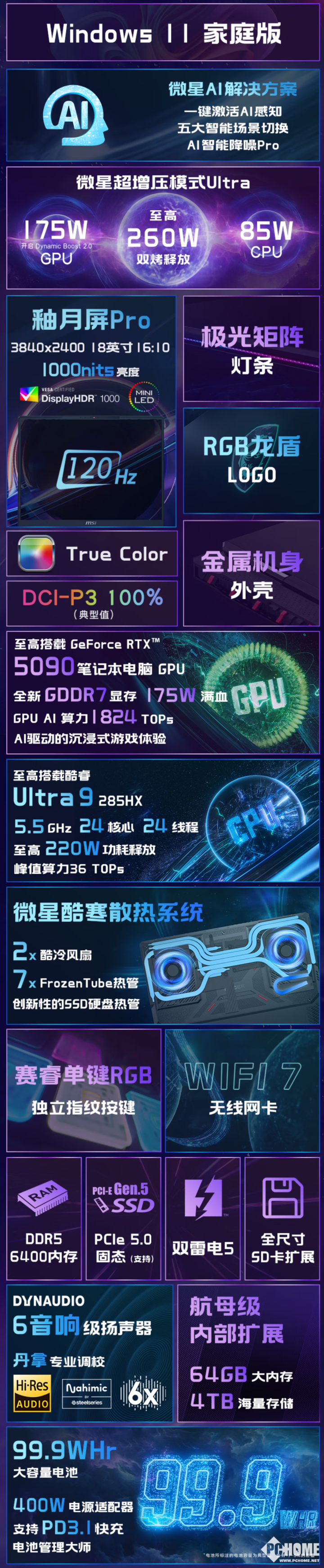 泰坦18 Pro AI 2025配备了英特尔第二代酷睿Ultra 9 285HX处理器,基于Arrow Lake架构,拥有24核心24线程,P核最高睿频可达5.5GHz,并能提供36 TOPS的AI性能,单烤功耗最高可达到220W,比上代性能提升20%。显卡则采用英伟达RTX 5090和RTX 5080笔记本GPU,基于Blackwell架构,可支持最新的DLSS 4多帧生成技术。散热方面配备Cooler Boost5散热技术,采用2风扇7热管的散热配置,最高双烤释放260W。存储方面,笔记本支持DDR5-6400内存,容量达到64G,并配备双M.2 SSD插槽,其中一个插槽支持PCIe 5.0速率。