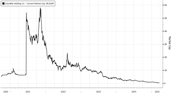 到了2021年,23andMe通过SPAC在纽交所上市,上市后该公司受到投资者追捧,股价一度高达363美元,市值超过100亿美元。但近年来,公司财务状况持续恶化,也难以建立可行的研究和治疗业务,股价也在持续下跌,到了周一,市值跌至2400万美元。