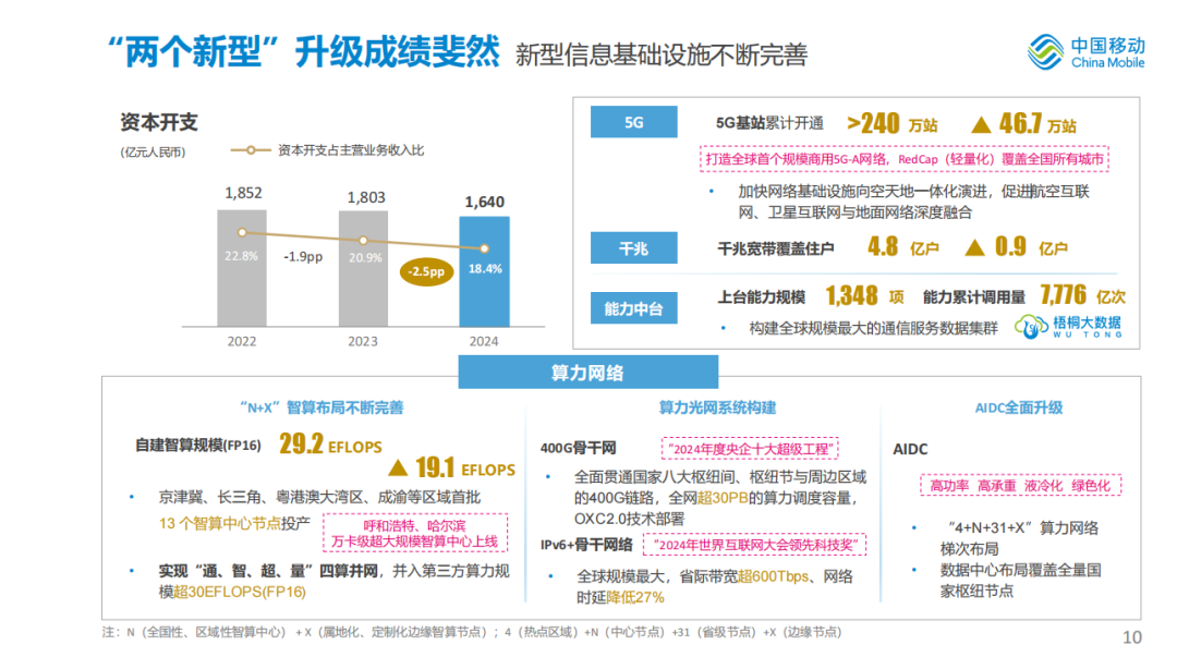 近日,中国移动发布2024年财报。财报显示,2024年中国移动不断完善新型信息基础设施,2024年完成资本开支1640亿元,累计开通5G基站超240万个,打造了全球首个规模商用5G-A网络,RedCap覆盖全国所有城市,千兆宽带覆盖住户达到4.8亿户。