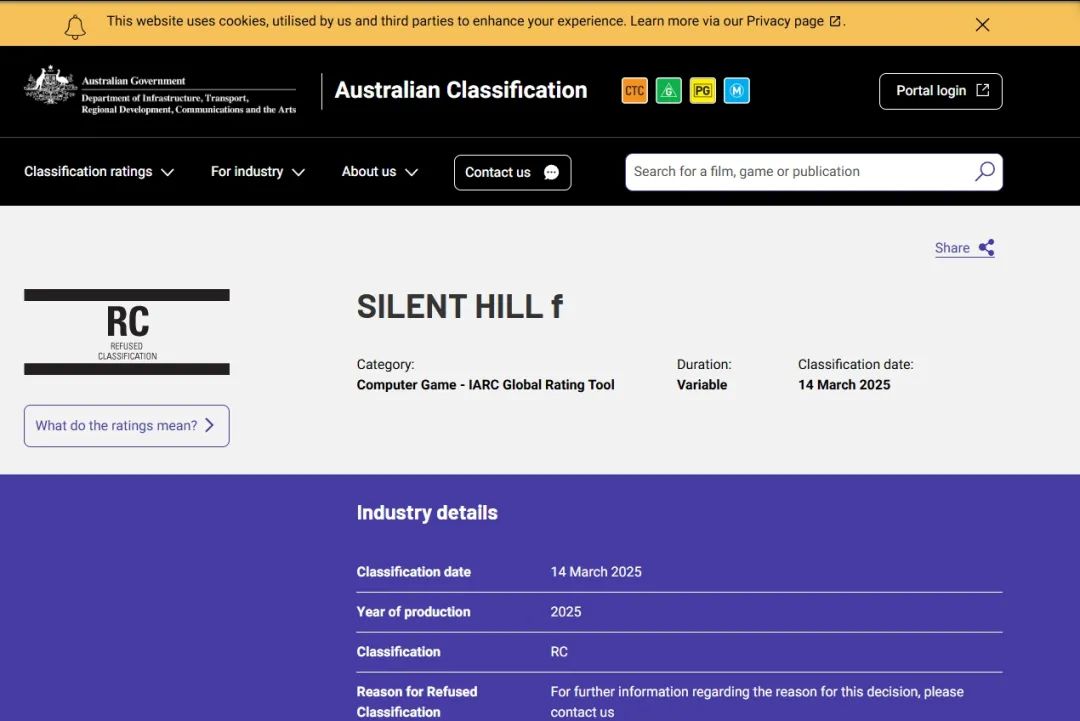 虽然游戏尚未公布正式发售时间,但在同一天,澳大利亚分级委员会却于官方网站上更新了《寂静岭f》的分级信息:RC(拒绝分级)。该分级页面现已不可见,不过能通过网页快照看到3月14日时明确的信息。