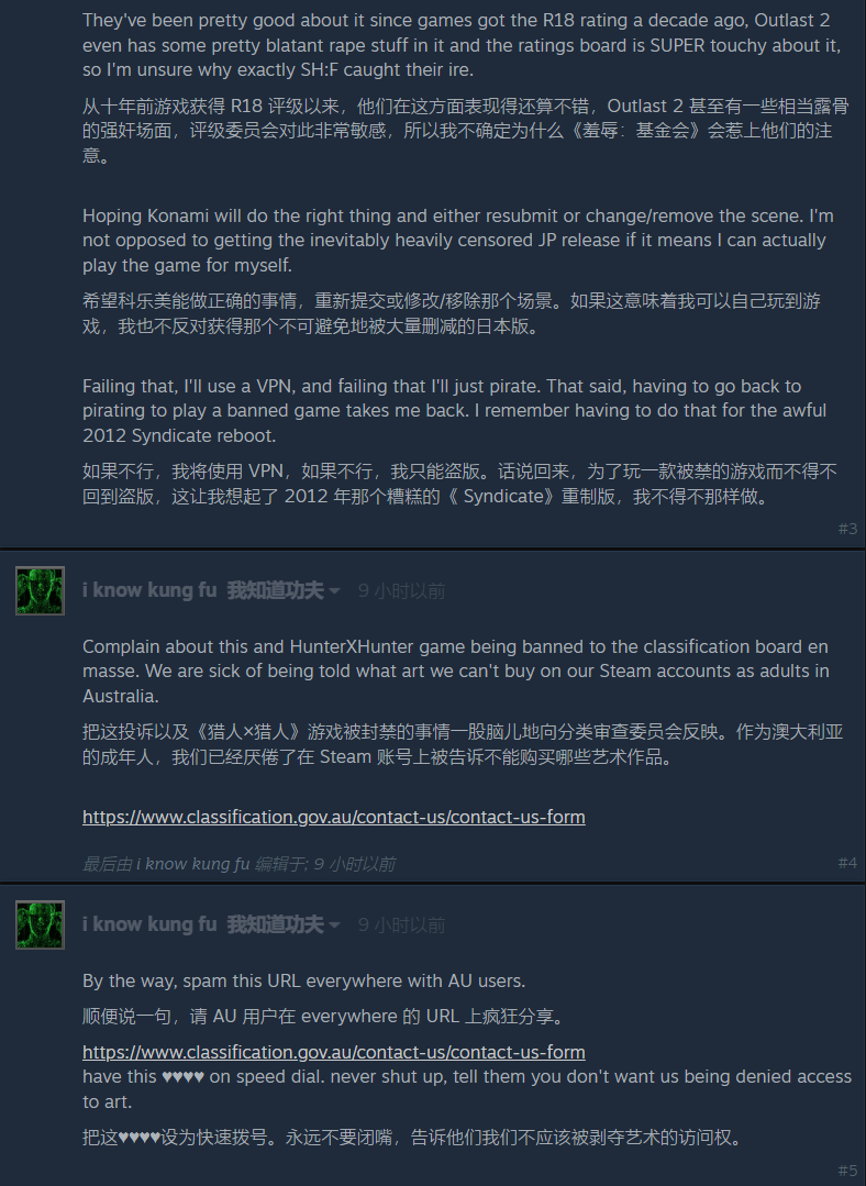 在Steam社区上,来自澳大利亚的声音充满了自嘲和无奈。《寂静岭f》的分级信息短暂释出后,有澳洲玩家破口大骂、也有人忧心忡忡,还有人倡导大家轰炸官网共同抗议,总之没人愿意回到除了盗版和代购别无选择的时代。