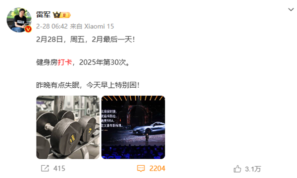 值得一提的是,雷军在2月27日的小米双Ultra发布会后,激动到失眠只睡5小时,即便如此他还是早早起床健身,28日早上6:42出现在健身房,十分自律。