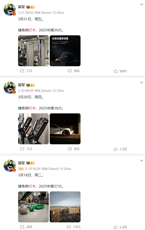 此后,雷军多次通过微博晒出在健身房的打卡记录,他最新打卡时间是3月21日,是2025年第39次健身。
