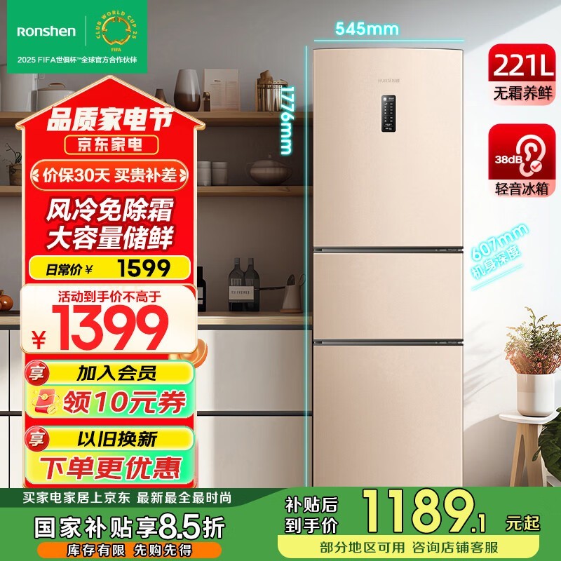 容声风冷三门冰箱BCD-221WD16NY黄金容量低价促销
