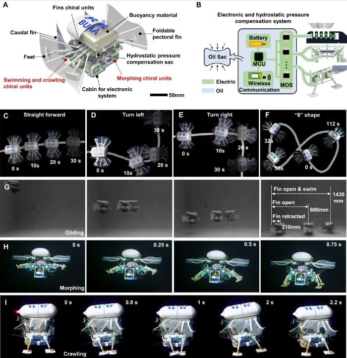 它能利用手性双稳态超材料结构实现0.75s内的游动-走动快速转换,适应不同的海底地形和任务需求。