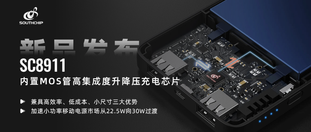 南芯科技现已建立起包含开关充电芯片、电荷泵充电芯片、线性充电芯片、无线充电芯片和 SoC 充电芯片在内的充电管理产品家族。其中,开关充电芯片提供升压、降压、升降压三种架构,可以对单节和多节电池进行充电和控制。新发布的 SC8911 兼具高效率、低成本、小尺寸三大优势,在小功率移动电源市场从 22.5W 向 30W 过渡的过程中,提供了极具竞争力的解决方案。