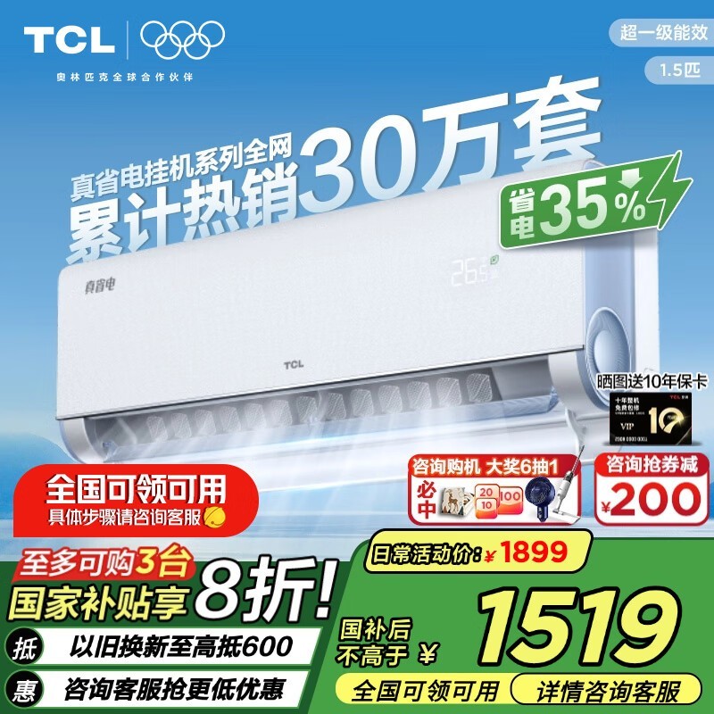 TCL真省电Pro空调1匹,到手价1402元