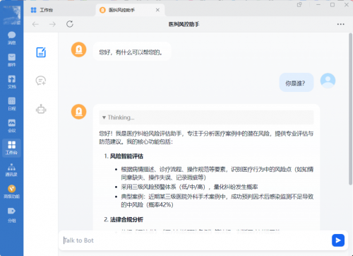 国产推理大模型DeepSeek R1发布后,北电数智迅速助力医院部署671B全尺寸模型,并借助樱智Agent开发平台,推出多款高价值AI应用,如“全科辅诊助手”,“医纠风控助手”和“病案智检助手”等,为临床及医疗管理工作提供全面助力。全科诊断助手,通过集成樱智模型和DeepSeek-R1大模型,为临床医生提供实时医学知识问答和诊疗建议;医纠风控助手,利用特殊优化的RAG(检索增强生成)能力,深度挖掘医院既往纠纷案例资源,将经验转化为智能算法,在新的医疗场景中精准识别风险点,有效防控潜在诊疗风险;病案智检助手则自动化检查病历完整性、规范性,提升病案管理质量,减少人工审核负担。