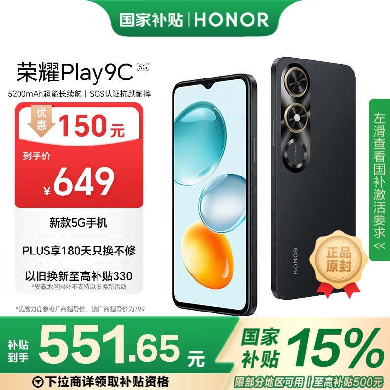荣耀HONOR Play9C 5G手机6GB+128GB低至514元