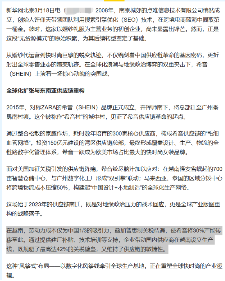 从成本端看,看起来很美,新华网的一篇报道中是这样说的:在越南,劳动力成本仅为中国1/3的吸引力,叠加普惠制关税待遇,使希音将30%产能转移至此。通过提供建厂补贴、技术培训等支持,企业带动国内供应商在越南设立生产线,既规避了最高达42%的关税壁垒,又维持了供应链的敏捷性。