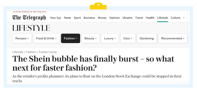 3月23日,英国媒体发表了一篇题为“希音 泡沫终于破灭了——快时尚的下一步又将如何发展呢?”的文章,并且在标题下面指出:“随着该零售商利润暴跌,其在伦敦证券交易所上市的计划可能会受阻”。