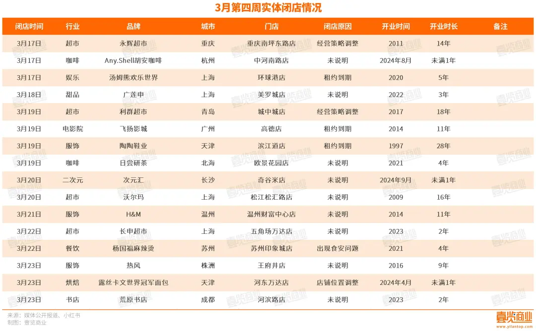 据不完全统计,3月第四周,共16个品牌关闭了至少16家门店。