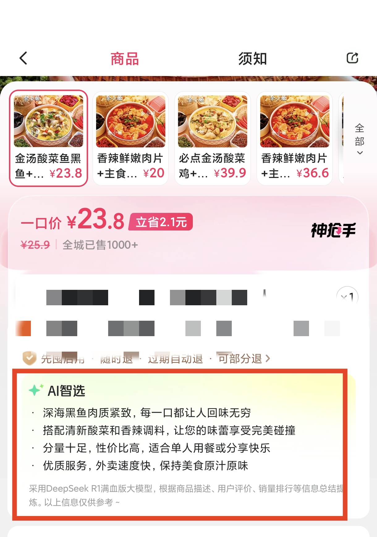 【亿邦原创】近日,美团神抢手全面接入DeepSeek。系统会根据商品描述、用户评价和销售排名等信息,自动提炼出店铺的真实亮点,给好品打上“AI智选”绿色标签。