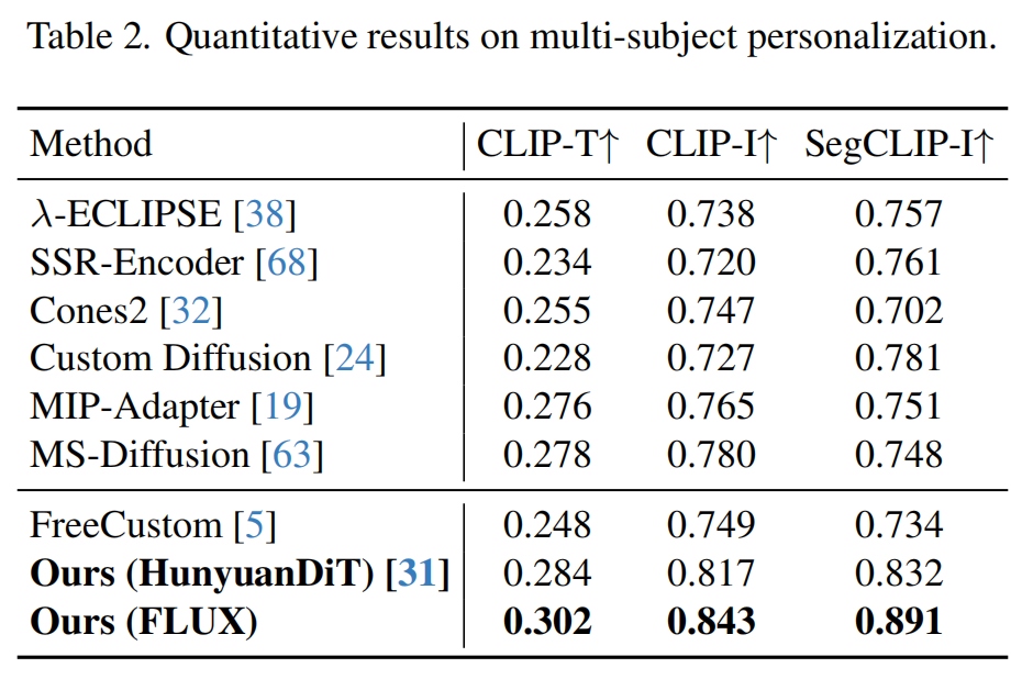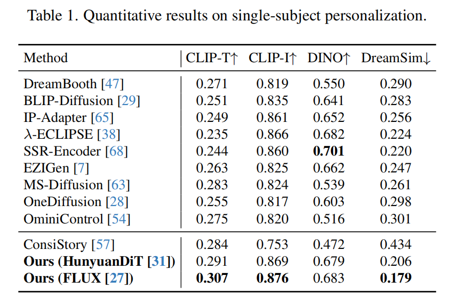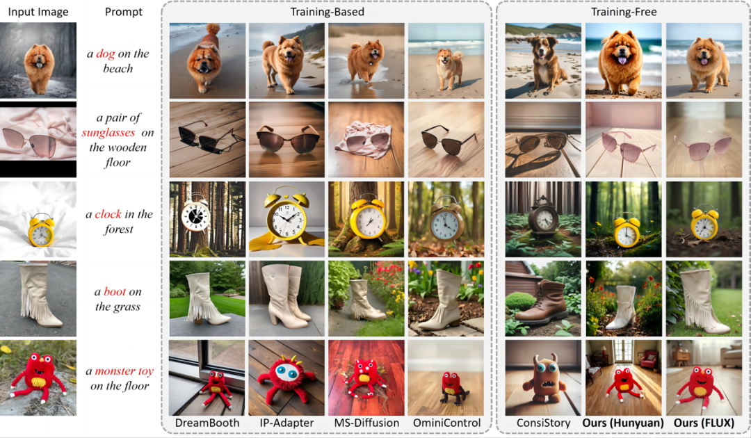 个性化图像生成的传统方法通常需要对定制概念进行微调,或者在大规模数据集上进行预训练,这不仅消耗大量计算资源,还影响模型的泛化能力。最近,无需训练的方法尝试通过注意力共享机制来避免这些问题,但这些方法难以保持概念的一致性。此外,由于这些方法主要针对传统的 UNet 架构设计,无法应用于最新的 DiT 架构模型,导致它们无法应用在更大规模和更好效果的图像生成模型上。