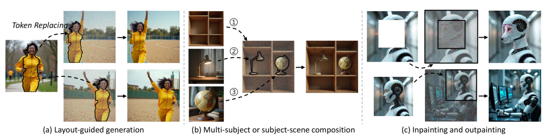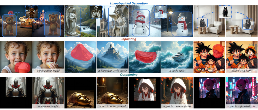 下面图像中依次展示了 Personalize Anything 在布局引导生成、inpainting、outpainting 三种任务上的表现。可以看到,Personalize Anything 在多种任务上都能够生成贴合文本的高质量图像。
