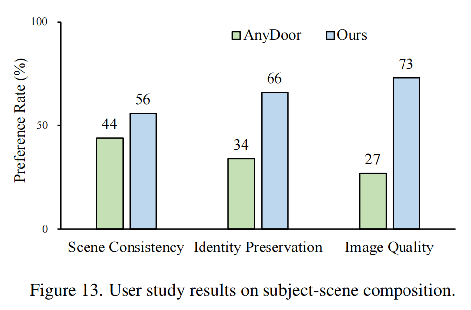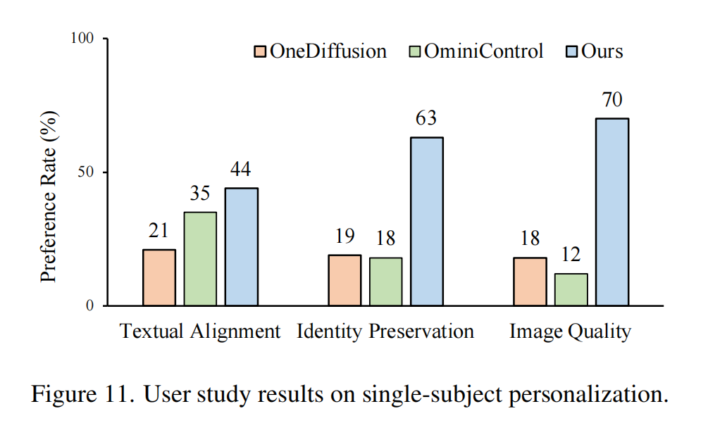 团队从单物体定制,多物体组合,物体 - 场景组合这三个任务入手,与众多优秀的开源模型进行定性定量的对比。可以看到 Personalize Anything 的结果基本都优于现有方法,并在后续的人类偏好测试中取得了显著优势。