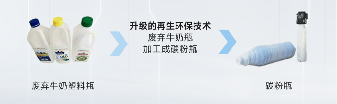 柯尼卡美能达采用回收的废弃牛奶瓶作为原料,通过升级的再生环保技术将其加工转化为全新的碳粉瓶,此举可减少约50%的温室气体排放量,从碳粉生产的源头开始降低对环境的影响。