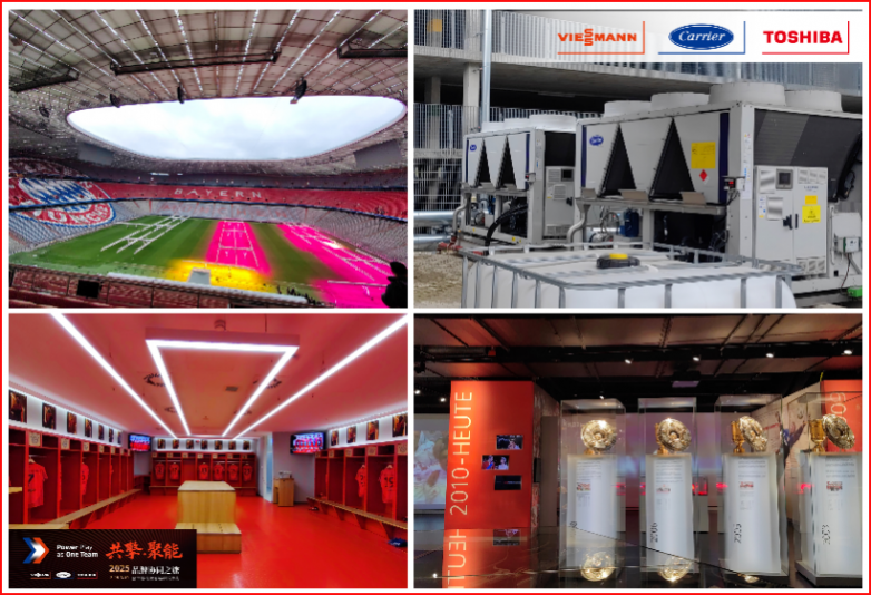 安联球场安装的开利热泵机组,用于球场草坪供热;球场的室内区域供热及生活热水由菲斯曼供热系统及大型锅炉Vitomax 300提供。