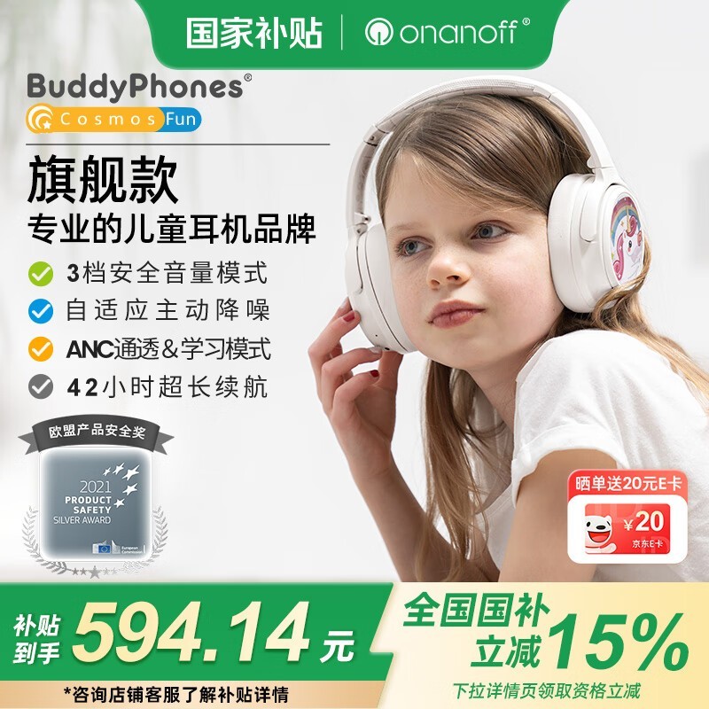 onanoff儿童蓝牙耳机CosmosFun冰雪白保护听力主动降噪