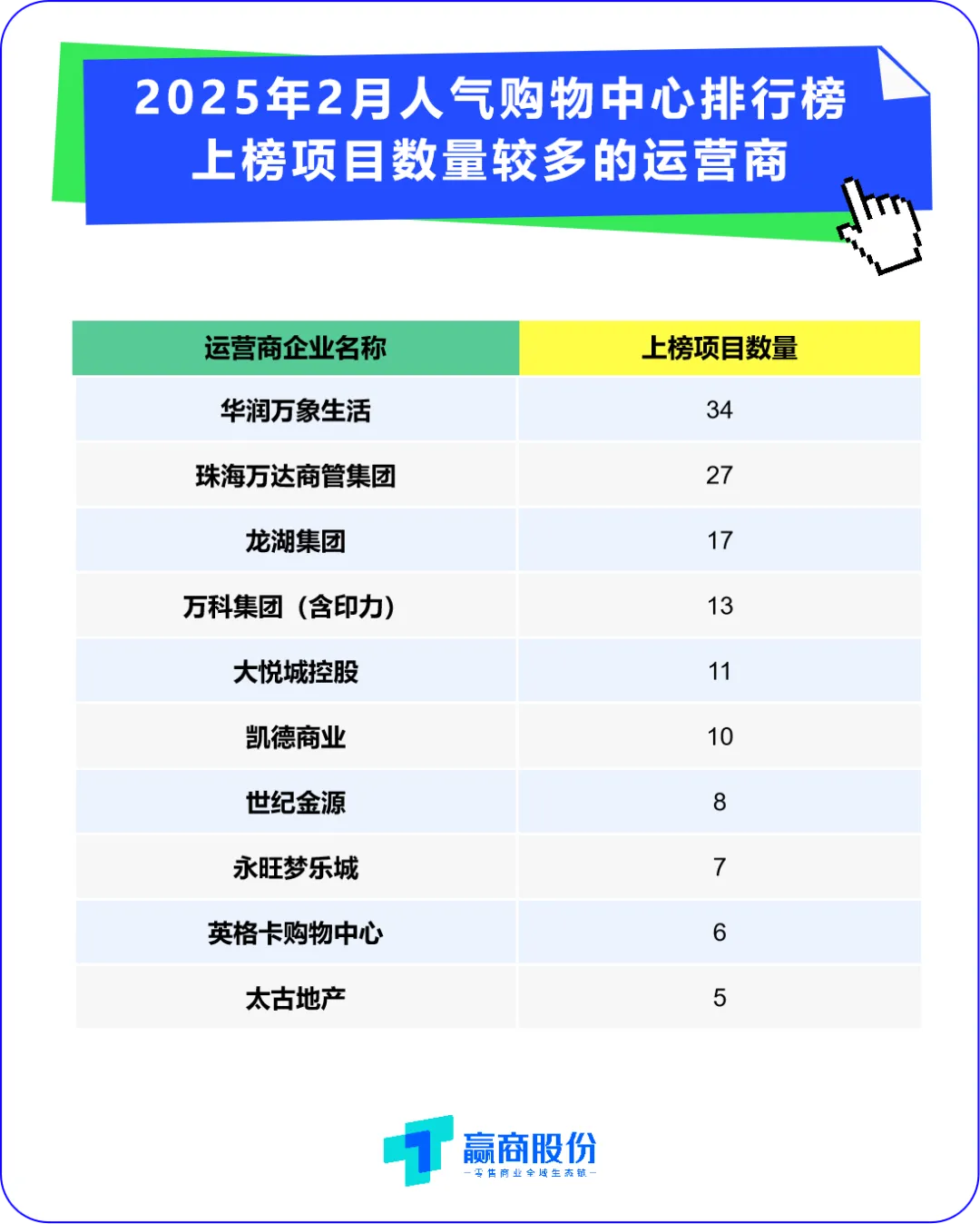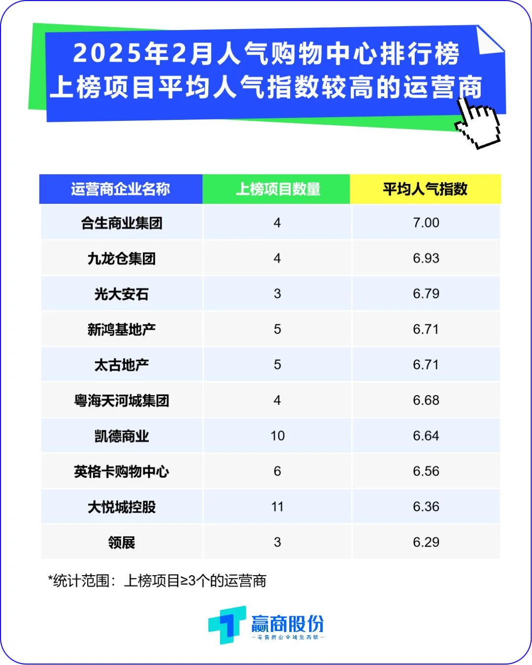 运营商企业方面,华润万象生活、珠海万达商管集团、龙湖集团、大悦城控股、凯德商业上榜项目数最多,在10个以上;上榜项目3个以上的全国连锁运营商企业中,合生商业集团、九龙仓集团、光大安石、新鸿基地产、太古地产上榜项目平均人气指数最高。