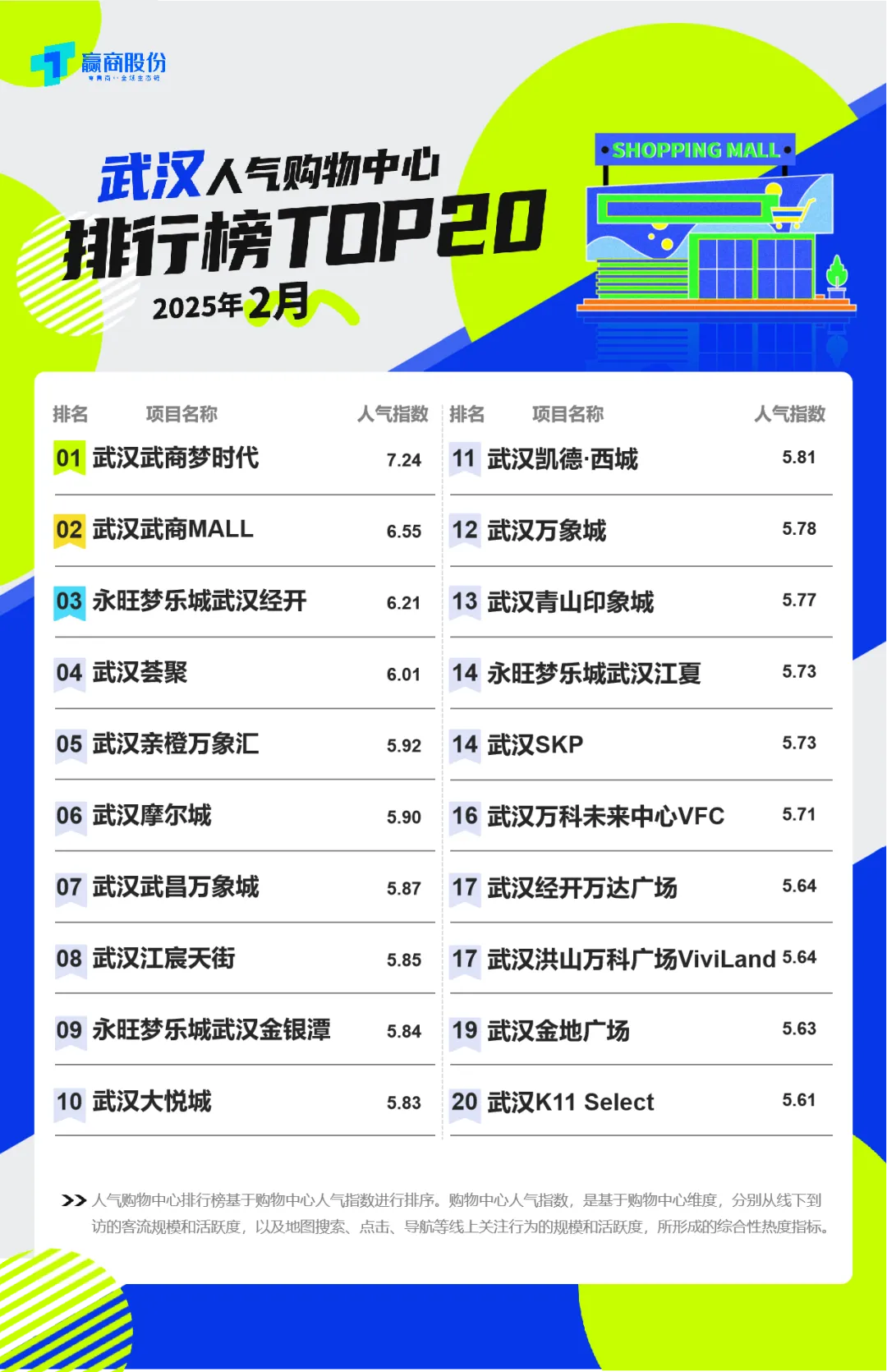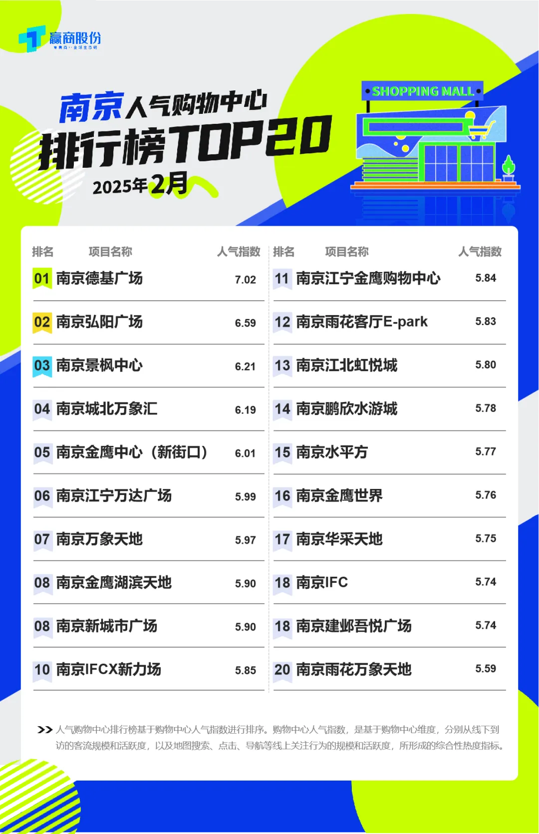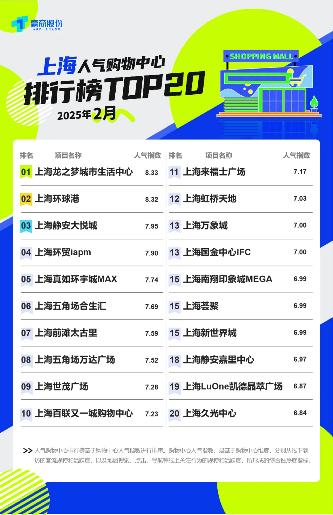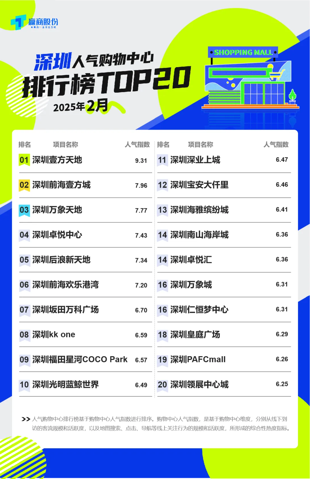 *榜单评选说明:10城评选TOP20人气商场(北京/上海/深圳/广州/成都/重庆/武汉/杭州/南京/西安)、12城评选TOP10人气商场(天津/苏州/宁波/青岛/合肥/厦门/东莞/南宁/长沙/郑州/贵阳/昆明),上榜项目合计320个。