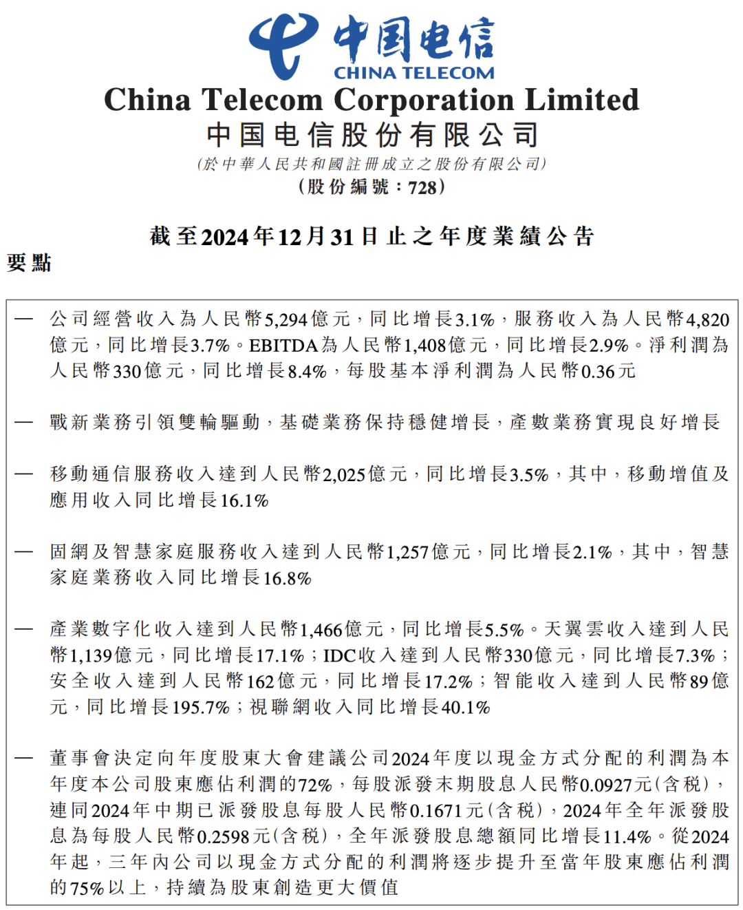 报告期内,中国电信实现净利润为330.1亿元,同比增长8.4%,每股基本净利润为0.36元。EBITDA为1408.47亿元,同比增长2.9%。资本开支为935亿元,同比下降5.4%。自由现金流为人民币222亿元,同比增长70.7%。