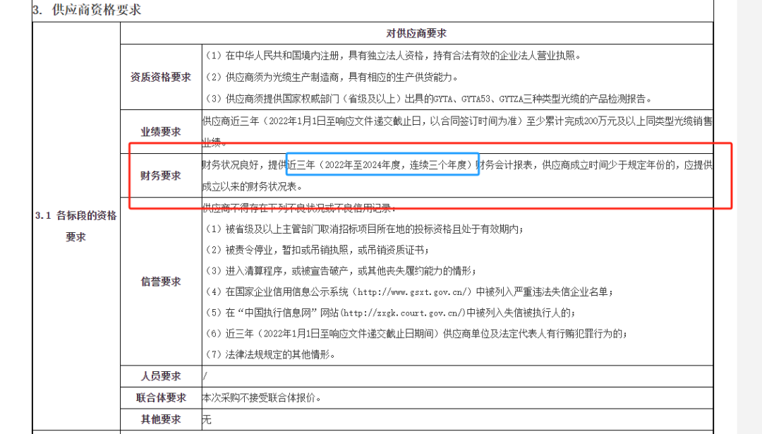 值得注意的是,项目明确了各标段的资质要求,包括业绩要求、财务要求、信誉要求等,其中,财务要求提供近三年(2022年至2024年度)财务会计报表,如果供应商成立时间少于规定年份,则需提供成立以来的财务状况表。