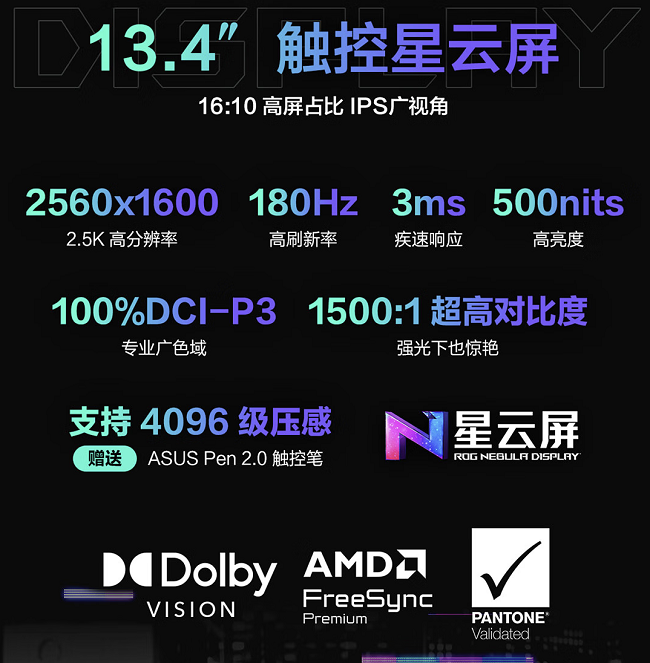 2.5K 180Hz 13.4英寸星云屏,支持4096级压感触控,100% DCI-P3色域覆盖通过了潘通色彩认证,满足设计绘图等创作工作对色准的严苛要求。屏幕表面附着DXC抗反射涂层,500nits峰值亮度,在户外环境下依然可保持优秀的屏幕可视性。四扬声器阵列通过Hi-Res认证,配合杜比全景声,为用户提供沉浸音效体验。
